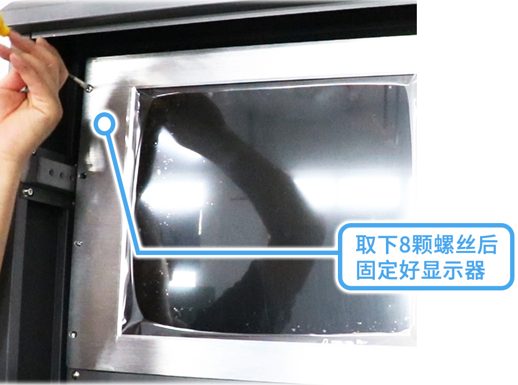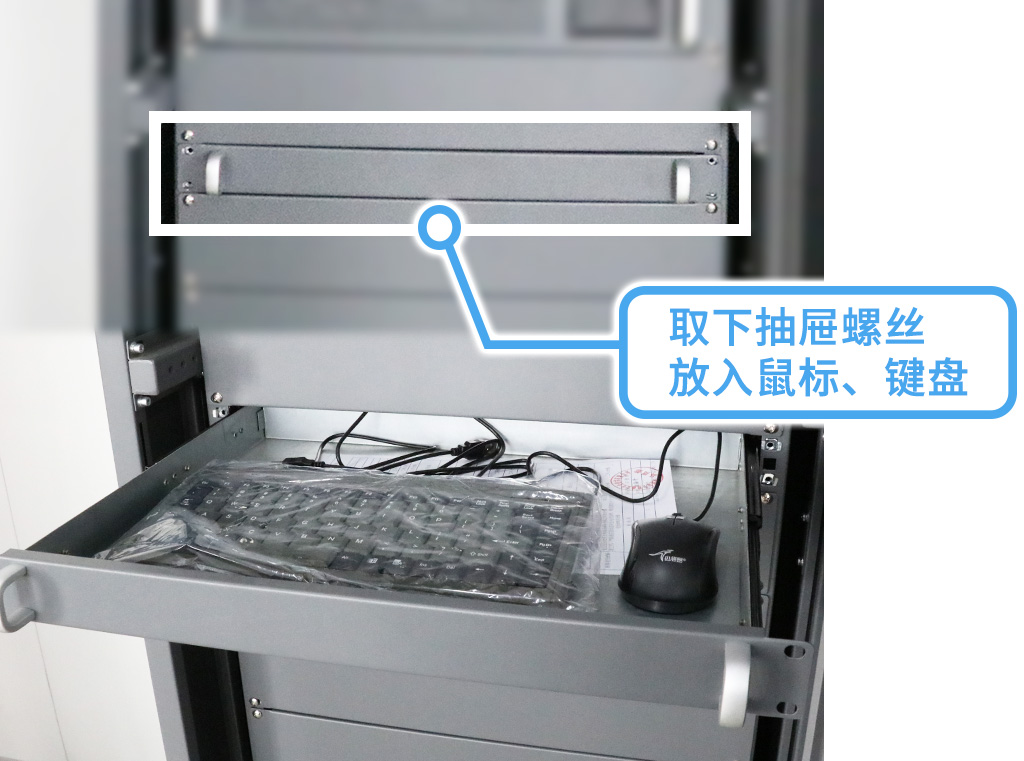 安裝主機(jī)前先取下抽屜螺絲,放置鼠標(biāo)和鍵盤(pán);再用工具固定好顯示屏8顆螺絲,然后翻轉(zhuǎn)到主機(jī)背面;