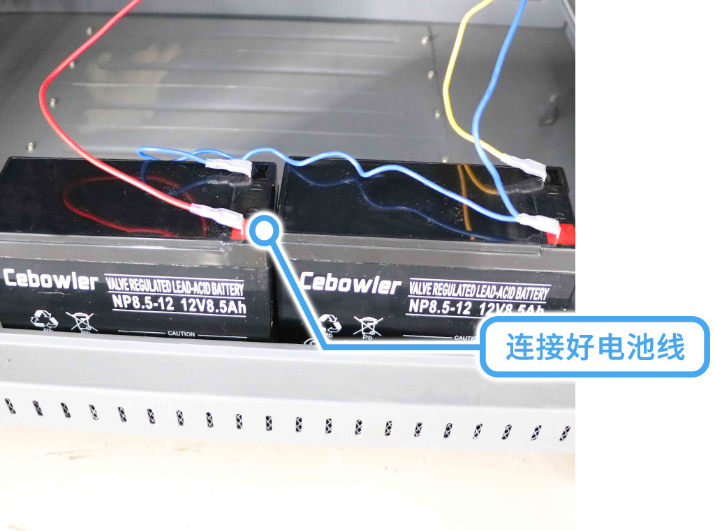 連接好電池線,兩節(jié)電池是串聯(lián)的,紅線接正,黃線接負(fù),藍(lán)線接兩頭中間;